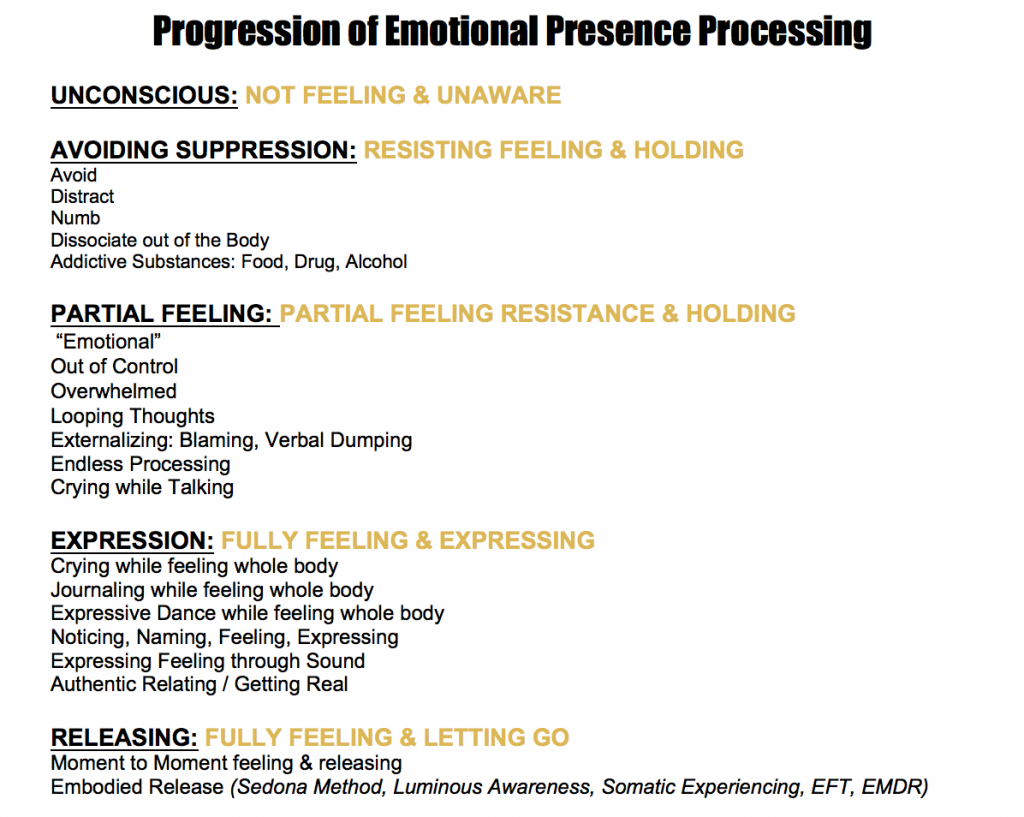 The Latin origin of the word emotion is “to move through or out” but in order for this to happen, we first have to be aware of emotions before we fully feel them, before expressing or releasing them. Unfelt and unintegrated emotions creates congestion in our system, looping ruminations and mental chatter, attraction to or avoidance of similarly emotionally charged people or situations. Emotional presence is our capacity to feel and maintain presence and connection with others amidst emotional intensity whether pleasurable or painful. This emotional presence requires staying in the sweet spot of feeling—neither avoiding feeling nor getting overwhelmingly lost in or attaching to it.  Emotions unfelt from the past or emotions too intense to feel and integrate in the moment, somehow seem to remain in subconscious or unconscious awareness. Sometimes when we seem to become emotionally triggered to a disproportionate degree, it might be pointing us to previously unintegrated emotional charge or trauma. The more inner emotional body-based healing work we do, the less past charge from the past stays stored in our body to get hooked or triggered, which in this context means less emotional content to process.  So in addition to releasing our emotional past, we each have a capacity to process emotion in real-time.  When we avoid feeling, numb, dissociate out of our body or we stay stuck in an emotion it significantly decreases our overall presence. The more hijacked is our attention in emotionally charged looping thoughts from an earlier event, the less free attention we have available. The more we can enhance our capacity to fully feel & express or release our emotions in the moment the greater the presence and aliveness we embody. Of course it is natural to get emotionally triggered but the virtue of the skill of emotional processing is the amount of time and how skillfully we can fully feel, express or release, reopen and reconnect. Emotional Intelligence is at the foundation of a civilized society in being able to feel empathy, morality–the moral impact of words and actions on others—and compassionate action for a better world. Overall, limited capacity for emotional processing is THE most significant inhibition to deeper presence.